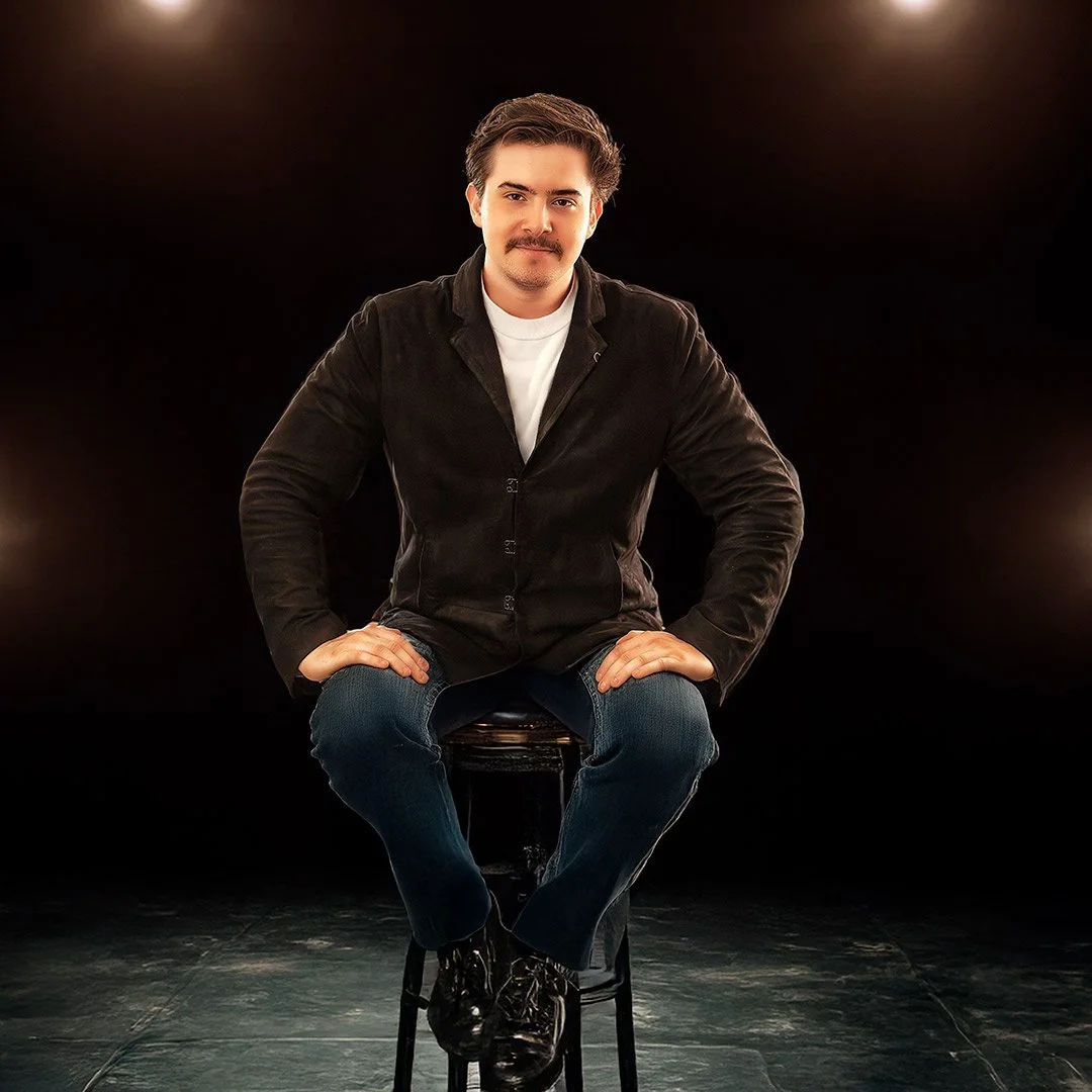 A young man with dark hair, a mustache, and beard, sitting on a black stool against a dark background with warm lighting.